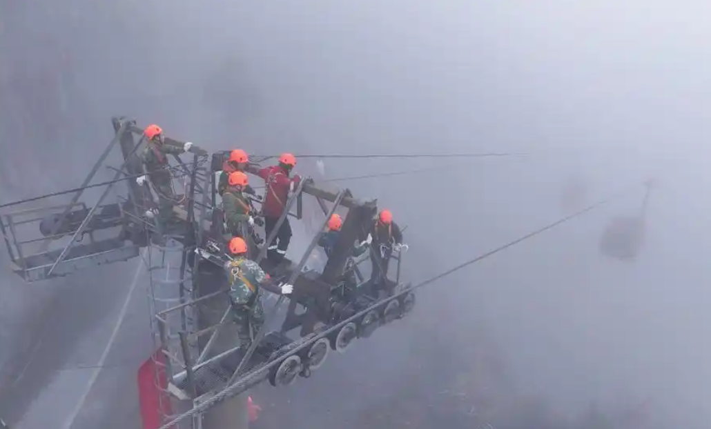 攜帶救援設(shè)備的數(shù)名專業(yè)索道救護(hù)人員迅速行動,攀上支架,在濃霧中以最快的時間抵達(dá)被困轎廂。他們將游客救助至安全地點,地面等候的醫(yī)護(hù)人員則第一時間對游客進(jìn)行救護(hù)和安撫工作。