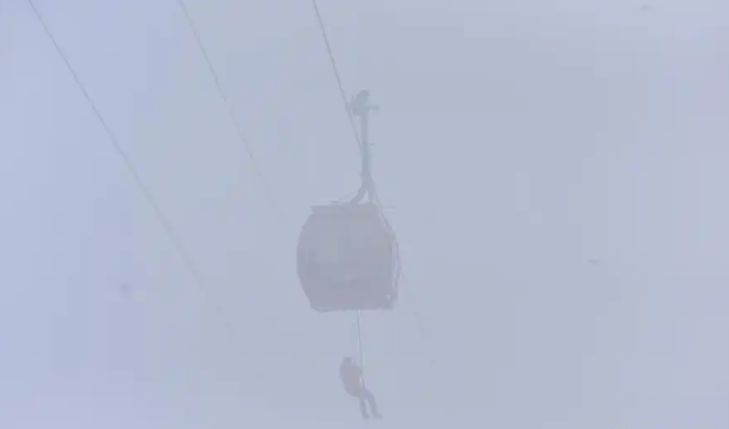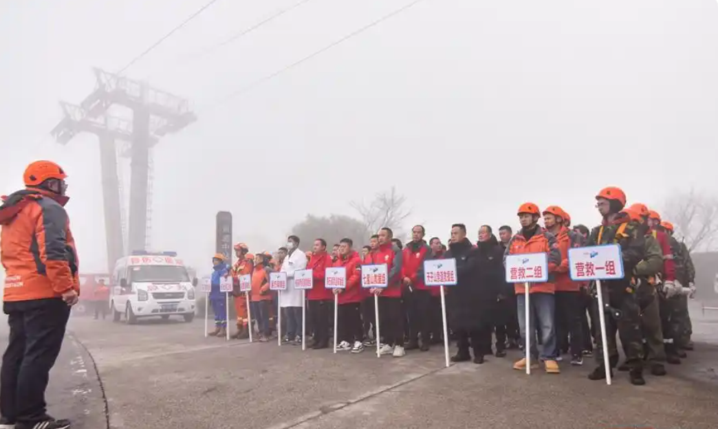演習(xí)正式開始,運行中的天門山索道突然停止,模擬轎廂中的乘客被困。今日山頂飄雪,演習(xí)現(xiàn)場大霧彌漫,能見度極低,這為救援行動增添了額外的難度和緊迫感。雖然現(xiàn)場氣溫接近0°,但救援人員已經(jīng)大汗淋漓。