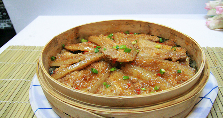 制作方法與我們平時家常菜粉蒸肉有些不同,更為復(fù)雜講究。采用合適比例的粳米和糯米,將辣椒、桂皮、八角、香葉等多種香料炒出濃郁的香氣,然后再磨成細粉,包裹在提前腌制好的肉片上,最后放入竹籠蒸制一小時。由于蒸制時間長,一部分油脂被釋放,成品軟糯潤滑油入口即化,醇香繞舌,完全沒有油膩的感覺。