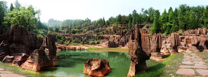 在眾多的奇觀絕景致中,最以“巨人園”,“古城故宮”,“八封奇陣”和“諸葛藏書”等景色最佳。石林東部有一尊高 12.26米的石柱,巍然聳立,挺拔偉岸,其神態(tài)模樣酷似領袖人物的雕像。神奇的是,再換一角度觀之,又極似立于川上,抒發(fā)“逝者如斯夫”感嘆的孔夫子。而位于另一旁的兩尊高大石柱,恰如從容就義的巾幗女英雄和屈子行吟圖,令人肅然走敬。因此,人們?yōu)檫@里的紅石林起了一個響亮動聽的別名----巨人園。