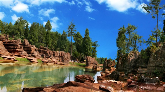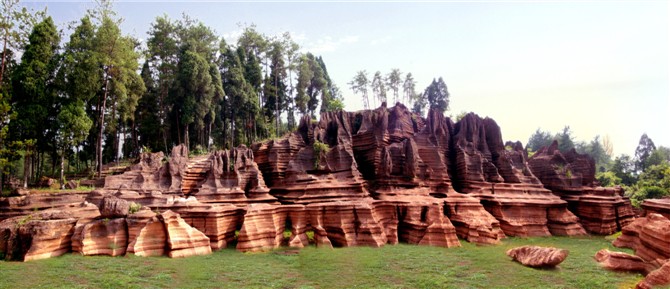 據地質專家考證:紅色石林巖石形成的歷史約4。5億年,地質史上稱之為揚子古海(海底沉積了大量混合泥沙的碳酸鹽物質,經地殼運動和侵蝕、溶蝕作用形成了這片美麗的地質奇觀)。景區(qū)內遍布高大奇石,造型各異、顏色變化多端,且隨天氣、時間、季節(jié)變化而變化,晴紅雨黑、陰轉褐紅、晨昏有別。 景區(qū)內石景有:蜀犬吠日、乳燕待哺、樓蘭古城、蝸牛搬家、七彩迷宮、利劍刺空、航母巡游、石兵列陣、少女出浴、觀音坐蓮、石鞭候主、靈龜探海、粽熊迎客、天狗吠日、水獺望云、母雞搗窩、駝鈴聲聲····尤以“巨人圓”、“古城故宮”、“八卦奇陣”、“諸葛藏書”為奇石絕景中的最佳。 景區(qū)內還有地下溶洞、絕壁天坑、神秘地坑、千年古木、土家山寨、土風民俗、集商遺址····