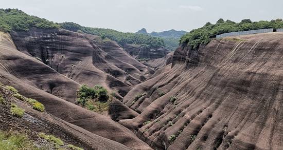 景區(qū)地質(zhì)構(gòu)造較復(fù)雜。區(qū)內(nèi)地貌類型多樣,既有典型的丹霞地貌,又有喀斯特溶洞景觀,公園集紅巖丹霞地貌,溶洞、碧水,溫泉于一體,更兼有古樸人物景觀之襯托。青山、綠水、紅崖赤壁、竹林深深,構(gòu)成一幅雄、奇、險(xiǎn)、秀,美輪美奐的自然畫卷。
